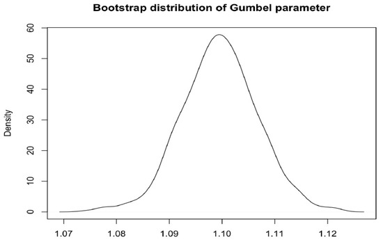 We remind that Gumbel’s parameter assumes values in , and for we have independence between marginal distributions. We observe that estimates were significantly different from 1, and so our Gumbel Copula did not correspond to the Independent Copula. We can say that because we verified using bootstrap procedures, the parameter has a Normal distribution. In fact, the Shapiro–Wilk test gave a p-value equal to 0.08551; thus, with a fixed significance level of 5%, it is not possible reject the null hypothesis. In addition, the 99% confidence interval obtained with Maximum pseudo-likelihood method was (1.090662; 1.131003), which does not include the value 1; the same confidence interval obtained with the Bootstrap procedure was (1.090662; 1.131003). In the following Figure 10 we report the distribution of the Gumbel parameter obtained by the bootstrap procedure.