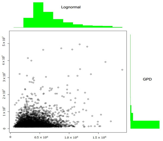 Lognormal (top) and GPD (right) marginal histograms and Gumbel Copula simulated values plot.
