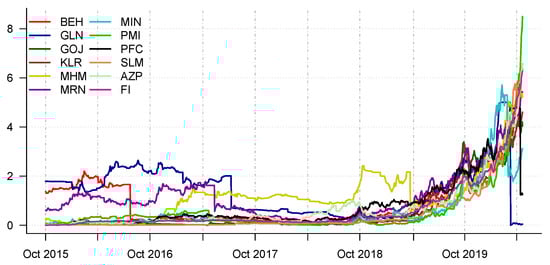 To better understand the systemic importance of the companies, Table 4 summarize the EDC network using standard network measures. Since the EDC is an undirected network, the in-degree and out-degree of nodes are the same for weighted and unweighted networks. The same is true for hub and authority centrality measures. The table shows that if centrality is expressed by the number of connected counterparties (degrees), then the most important companies are KLR alongside MRN, followed by BEH, GOJ, MHM, and AZP. By weighting the connections among companies, KLR is ranked the most influential in terms of connectedness. Although MHM is highly interconnected with the rest, the associated weighted degree is −0.8734 since it is negatively correlated with almost all the others. If centrality, however, depends on the importance of an individual’s neighbor’s (i.e., eigenvector centrality), then the order of ranking of assets coincides with that of the degree.