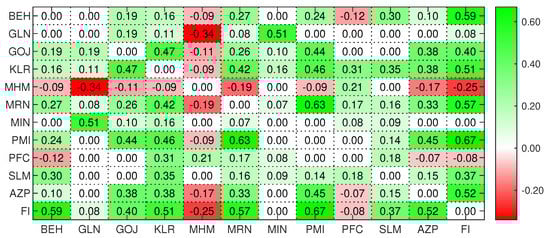 Figure 4. EDH estimates for combined systematic and systemic risk model. The light (dark) green indicates weak (strong) positive reactions, and light (dark) red for weak (strong) negative sensitivity. Column labels are Δ C V a R (Explanatory Variables) and row labels are Y i , t (Dependent Variables).