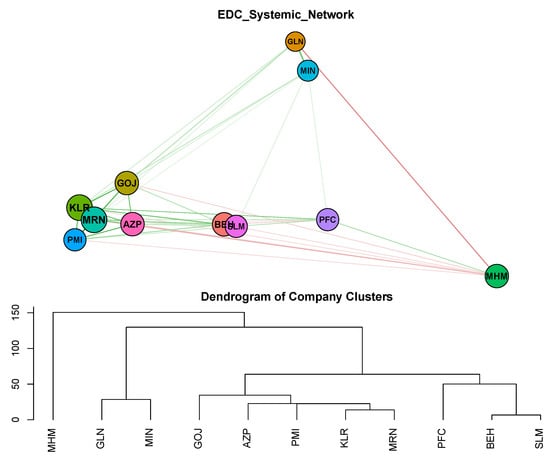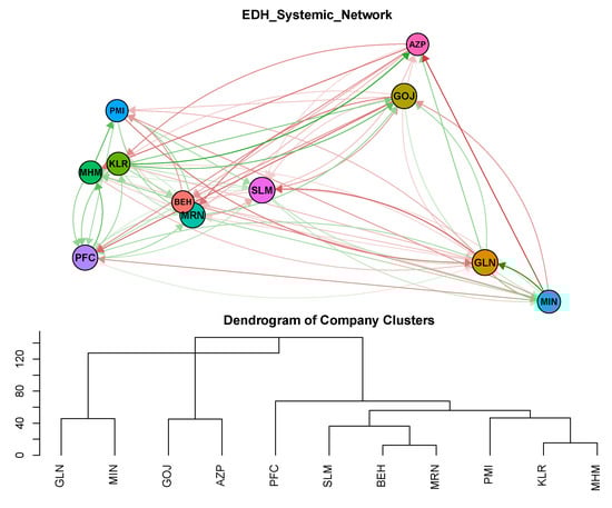 Figure 5. EDH systemic network ( 5 % -quantile level) and dendrogram. The links are color-coded to describe the sign of the statistical relationships with green for positive associations and red for co-movements. The size of the vertices corresponds to the node-degrees.