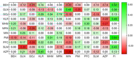 Table 3. Ranking tail correlation coefficients between companies and Food Industry index. The light (dark) green color indicates weak (strong) positive correlations, and red indicates negative correlations.