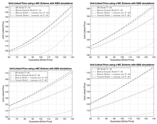 For simulation purposes, the Monte Carlo scheme was implemented using 5000 simulations. The following graphs in Figure 1 result from the implementation of the previous models with the mentioned initial conditions, and for As one can see in Figure 1, it seems like the classic Black-Scholes model tends to underprice the risks derived from volatility and interest rate risk. It is worth noting that the difference between prices increases with both time to maturity and the guarantee. When it comes to what source of risk is bigger, it seems like the fundamental risk lies in the driving interest rate.