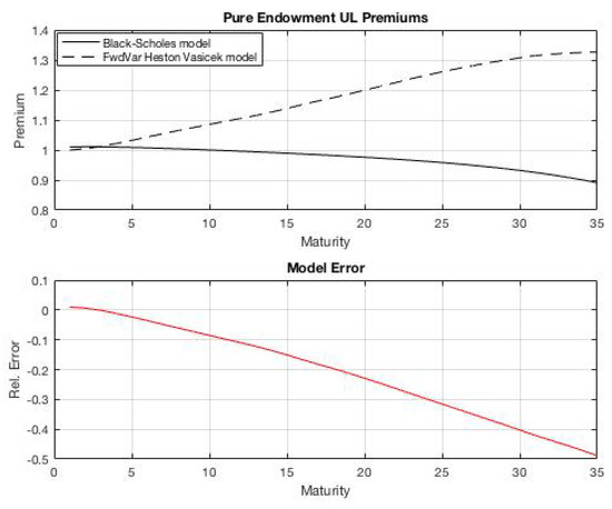 In Figure 6, we compare the single premiums using the classical Black-Scholes unit-linked model in contrast to the Vasicek-Heston model proposed for different maturities T with parameters , , and , for the Black-Scholes model, and , for the Vasicek-Heston model.