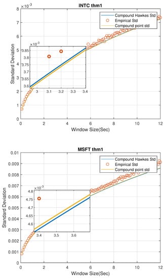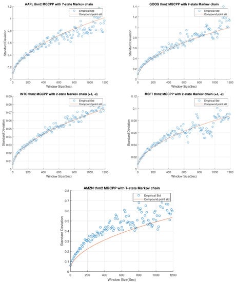 Comparisons of real standard deviation and theoretical standard deviation can be found in Figure 5. Since results of INTC and MSFT are good enough with the 2-state Markov chain in FCLT I, we also applied 2-state Markov chain for INTC and MSFT here. As for AAPL, GOOG, and AMZN, we used the MGCPP model with 7-state Markov chain. Window sizes here start from 1 s and increase to 20 min in time steps of 10 s. As can be seen in Figure 5, the results for FCLT II are as good as the FCLT I results in Figure 1, Figure 2, Figure 3 and Figure 4. We also computed the MSE and coefficients in Table 9. Benchmark coefficients are from the least-square regression curves which are similar as benchmarks in Table 6.