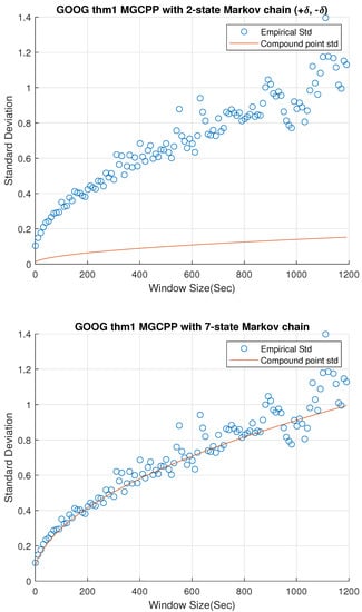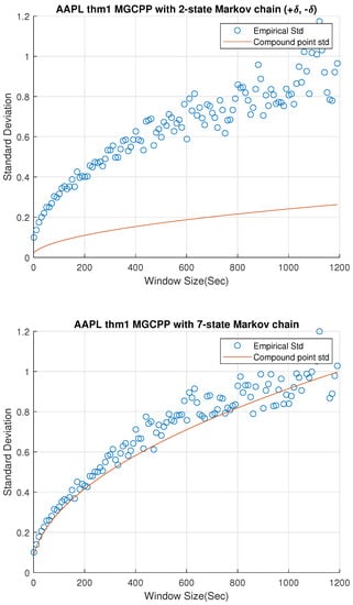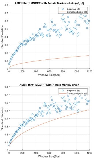 Figure 2, Figure 3 and Figure 4 give standard deviation comparisons for MGCPP with 2-state Markov chain and 7-state Markov chain simulated by different tickers’ data. Since the 2-state simulation results here are not as good as the results simulated by Intel’s and Microsoft’s data, we take bigger time steps and window sizes (from 10 s to 20 min with 10 s time step) to capture more dynamics. From figures we can find that the 7-state model has a significant improvement than the 2-state model. Seven-state curves for AAPL and GOOG are very close to the real standard deviation, although the theoretical curve of AMZN is underestimated even with the 7-state model.