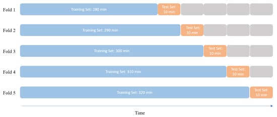 In this section, we tested the forecast ability of the MGCPP model. Since we did not assume the multivariate point process is stationary, we cannot apply the K-fold cross-validation directly. Here, we used the rolling K-fold cross-validation method which proposed in Bergmeir et al. (2018). We divided the last 50 mins’ data into 5 disjoint 10-min windows for each stock. For the fold 1, We take the first 280 mins’ data as the training set to estimate parameters. Then, we applied the data in the next 10-min window to calculate the percentage error. Next, we merge the test set into the training set in fold 1 as the new training set in fold 2 and apply the next 10-min window as a new test set. Repeating this procedure 5 times, we will get 5 percentage errors. The mean value of the 5 percentage errors will be the test error E for this stock. So, the overall test error for our multivariate model is the average of all test errors. Figure 6 gives an example diagram for the rolling cross-validation.