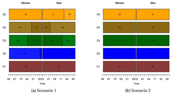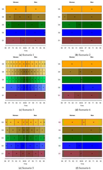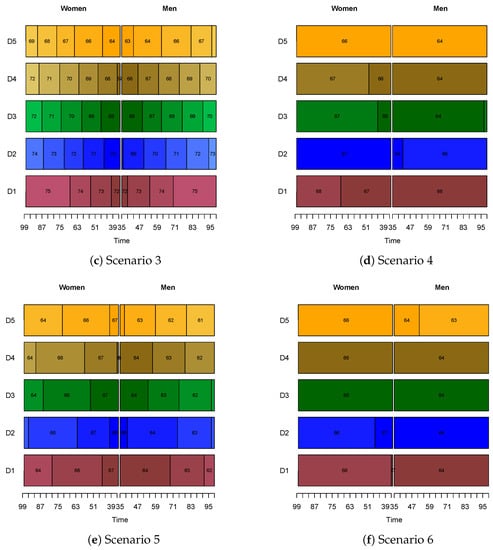 Lastly, we noted that in the cases where the retirement age was not equal across all classes and time, individuals of lower classes, be they men or women, would decide to retire earlier. For example, in Scenario 3, men in class D5 would retire between the ages of 63 or 68, depending on the time, while those in class D1 would take retirement between 72 and 75. For women, the retirement age for class D5 in this case ranged from 64 to 69, while the optimal age for those with the highest level of education remained between 72 and 75. Similar observations could be drawn for the NDC scheme and the rest of our scenarios, displayed in Appendix A. This was reasonable, since the mortality rates for those of lower classes were higher. Hence, given their decreased life expectancy, it was expected that their optimal retirement age was lower.