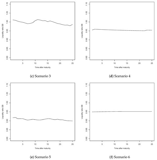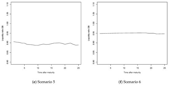 Liquidity ratios for the DB system, when utility of leisure is considered, for Scenarios 1 to 6.