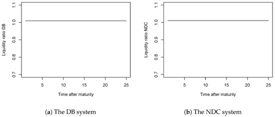 Additionally, we plotted the liquidity ratios given the retirement ages displayed in the above table (Figure 5). In this case, we sawa that the liquidity ratios were slightly larger than 1 (1.009 for the DB system and 1.01 for the NDC scheme). This means that both systems were viable on a yearly basis15. Thus, by utilising the method described here, the systems could meet their dual goal. They could define the retirement ages for each class, thus protecting those in lower classes, and maintain their financial viability.