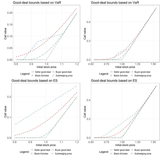 Compared with the Black-Scholes and subhedging price the good-deal bounds w.r.t. the ES do not admit an unexpected behavior. For the VaR the buyer good-deal bounds seem plausible. What is not directly intuitive is that the seller’s bound is sometimes lower than the buyer’s bound. For instance, this is the case for stock prices in the interval . For a specific and any we obtain: