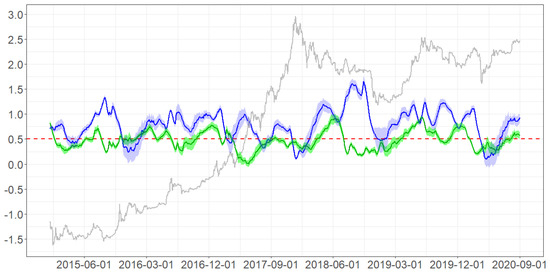 DFA exponent time evolution. The plot exhibits the DFA exponent (Peng et al. 1994, 1995) for returns (in green) and volatility (in blue). Estimates consider sliding windows of 250 daily observations and one datapoint step forward. The shadow area refers to the standard error of the corresponding coefficient. The log of Bitcoin prices (divided by ) is reported in gray. The dotted red line stands for the 0.5 level of the DFA exponent.