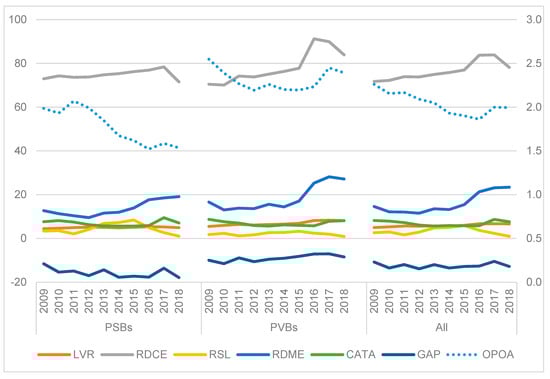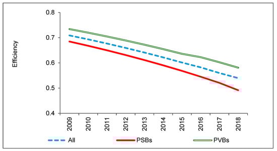 The negative and significant value of η indicates that, on average, efficiency has declined over the sample period. A comparison of η between PSBs and PVBs shows that the efficiency of PSBs, on average, declined at a higher rate than that of PVBs. An analysis of estimated efficiency of individual banks from model 1, using Equation (2), further reveals that PSBs, on average, were less efficient than PVBs in trading risk against return and the efficiency of public sector banks declined at a higher pace as seen in the value of η (Figure 2). To check the robustness of the model, we also estimated model 1 with ROA as the output variable. However, the estimated and η are found to be similar to those produced by model 1 with OPOA as output.