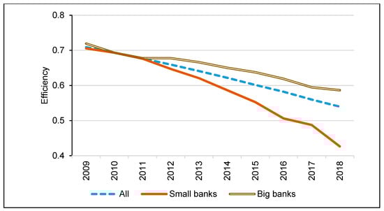 The negative and significant coefficient of OWNERSHIP in model 2 reveals that PVBs, on average, were more risk efficient than PSBs during the entire sample period, which is again in line with the results of model 1. The coefficients of the interaction terms REGIME × OWNERSHIP in model 2 is not statistically significant. However, the behaviour of banks in managing risk-return trade-off significantly varied between PSBs and PVBs. While both return and risks of PVBs increased during the Basel III regime, a declining trend is seen for PSBs (Figure 1). The counter-cyclical lending strategy followed by PVBs helped them to maintain asset growth and profitability during the entire sample period. However, their risk level, particularly ex-ante credit and market risks, RDCE and RDME, were higher than that of PSBs despite lower NPAs. This was because PSBs could clean up a higher proportion of advances through write-offs of the NPAs that attract higher risk weight in RDCE calculation than that of PVBs. Moreover, PVBs’ portfolios consisted of a higher proportion of off-balance sheet items that are exposed to both market and credit risks. However, the asset liability GAP was higher for PSBs. Therefore, our study establishes that PVBs are not only profit and cost efficient as reported in the previous studies, but they are also more risk efficient when compared to PSBs. The negative and significant value of the estimated coefficient of the control variable SIZE indicates that bigger banks were more efficient in managing risks. Mean efficiency of small and large banks obtained from model 1 also confirms this (Figure 3). In fact, the efficiency of small banks, on average declined at a higher rate compared to large banks. This result is in alignment with previous studies on profit and cost efficiencies of Indian Banks (), and it reconfirms theories on the scale of the economy, which facilitates banks in putting in place more sophisticated risk measurement processes and gives them more pricing power.