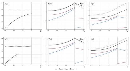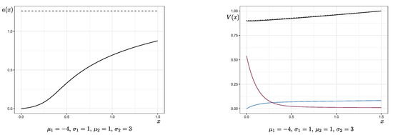 According to Lemma 6, the function is strictly increasing with and bounded from above by the constant . If the drawdown approaches the critical value d, the amount invested increases up to the level . The drift from the investment is supposed to keep the process’ paths in the uncritical area. is the critical value for which the added volatility from the investment is too risky and may push the process over the critical line. In the numerical examples, it can be observed that, if the drift of the original portfolio is negative, the investment function grows larger in a shorter time. If, for regulatory reasons, it held that , the function a would retain its shape, except for staying at once this level is reached (see Section 4.1 for an example with ). As shown in Theorem 3 the value function is increasing and convex in all cases. Moreover, only in the case of , the second derivative of V is increasing as well. For a comparison, the Laplace transform of the first passage through d under the strategy of never investing, that is, for all , is pictured in the graphs on the right-hand side (dotted lines). We see here that V is only slightly smaller. However, this effect will be striking for the solution of the general problem.