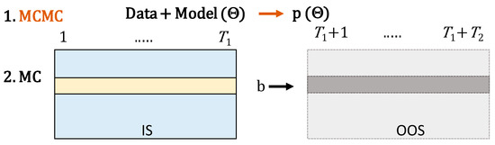 First, of course, we need to specify a model defining the return generating process with unknown parameters for the observed strategy returns , where or . Then, the plan is to use a Bayesian technique, specifically, the Markov Chain Monte Carlo (MCMC) simulation, in order to extract the posterior distribution of the model parameters . Finally, we simulate the matrices of IS and OOS returns over desired time intervals and . The Monte Carlo (MC) is done in two steps, always selecting the parameters from the posterior distribution and then generating series of returns according to the model. The simulated IS returns can be used to select the best strategy and the OOS returns to measure its future performance. The average haircut or average relative rank can be easily estimated as in the case of the stationary bootstrap (see Figure 4).