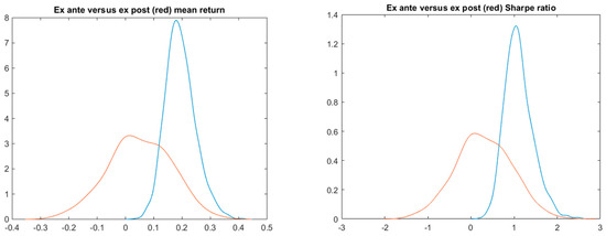 Stationary bootstrap simulation Sharpe ratio and the mean return ex ante (blue) and ex post (red) probability densities.