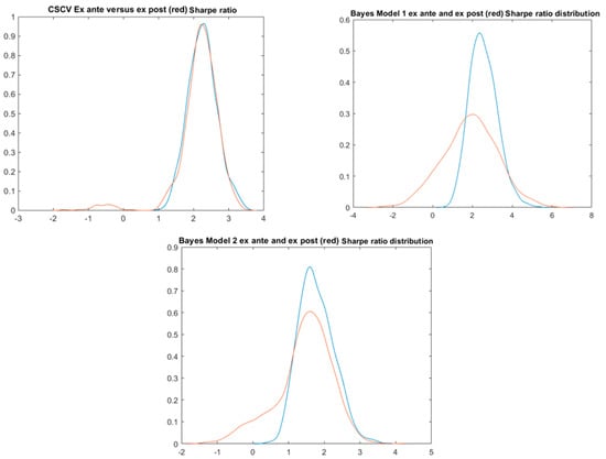 The simulations of the ex ante (blue) and ex post (red) SR probability densities.