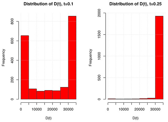 By construction, the cumulated number of deaths up to time t is proportional to the integral of . Unfortunately, the statistical distribution of is unknown and, therefore, reinsurance treaties covering excess of mortality must be valued by simulations.