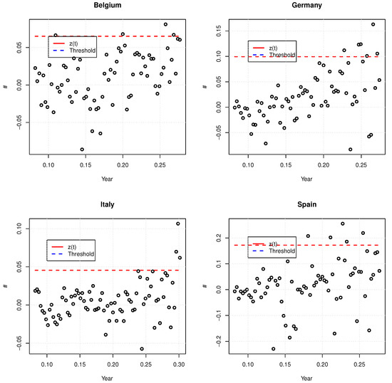 Figure 6 shows those series and the threshold level. For Spain, we have not taken two abnormally high and low values into account due to retrospective adjustments of the number of confirmed cases. For Belgium and Spain, the
