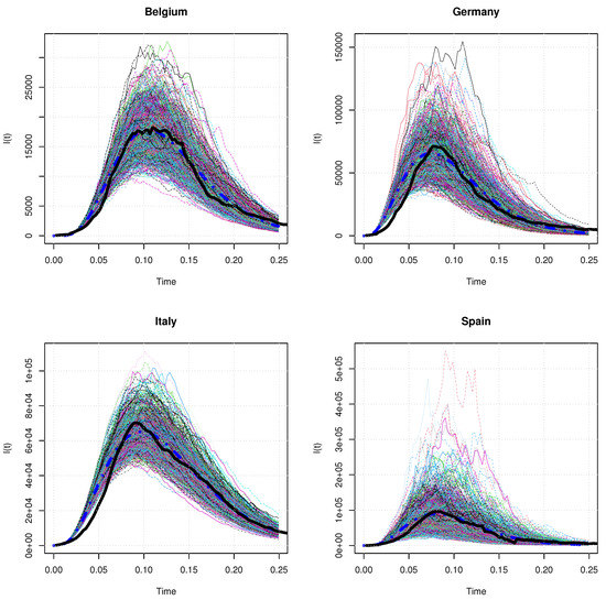 Contrary to the time-changed approach, the jump diffusion model generates smoother sample paths which all appear as likely scenarios for the evolution of the infected population. These graphs also display the expected and the observed number of infected cases for each country. It reveals that the real sample path of