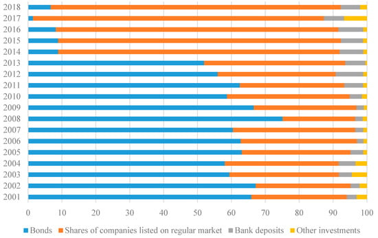 Structure of investment portfolio of OPFs in the Polish pension system, 2001–2018 (in %). Source: own study based on Komisja Nadzoru Finansowego, Publikacje i opracowania, Dane statystyczne, Rynek emerytalny, https://www.knf.gov.pl/publikacje_i_opracowania.
