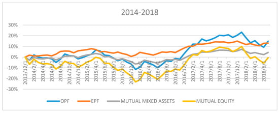 In the second of the analyzed sub-periods, there were significant changes in the market exposure of the analyzed portfolios. The biggest changes concerned OPFs, the return of which was no longer dependent on trends in the government securities market. Concurrently, the parameter related to the WIG index in the case of OPF came close to the analogous parameter for equity mutual funds. There was a complete change in the investment profile of OPFs, which in this sub-period were characterized by a risk level similar to equity funds. Therefore, our research partially confirmed the findings of (), who also observed an increase in the investment risk of OPFs. Additionally, the situation in global markets had a greater influence on the returns achieved by OPFs. There was also a change in exposure to risk factors derived from the six-factor model. The size factor was much more important; however, the importance of this factor also increased in the case of other analyzed portfolios, which may be related to the overall market situation. In the case of OPFs, the UMD parameter was also important in the 2014–2018 sub-period, which means that managers used the momentum effect in this period, which was not observed in other portfolios. Regarding mutual funds available under the IRA and IPSA, the profitability factor was statistically significant. This suggests that, as far as the equity portfolio is concerned, the funds in these portfolios used different strategies to OPFs and EPFs.
