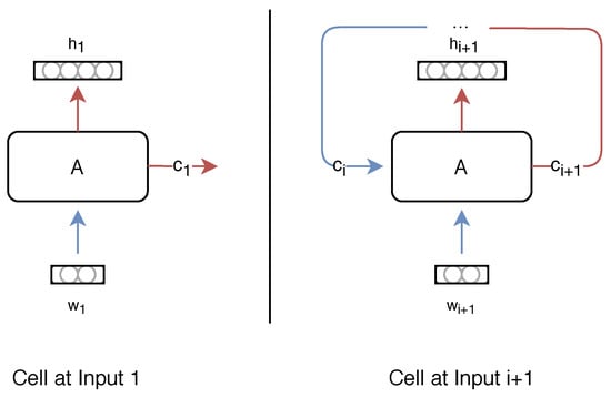 Recurrent neural networks (RNN) are neural models that are designed to process sequential data. As their name suggests, the network is iteratively applied to each element of a sequence. As illustrated in Figure 1, the inputs are successively fed to the recurrent cell A. The cell keeps track of past inputs using its hidden state vector and outputs its current state with the vector . Vectors h and c are of equal dimensions, and their difference resides in the implementation of the cell A.