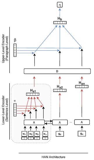 The hierarchical model presented in this work accommodates inputs that are aggregated twice. More specifically, the engineered architecture, presented in Figure 2, allows for the conversion of multiple words into a document. The first level of the model uses recurrent cell A to aggregate words into sentences, with the attention weights highlighting the crucial terms within the sentence. The second level uses cell B to aggregate sentences into paragraphs, with the attention weights highlighting the most critical sentences within the document.