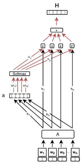 In our work, we implemented the attention mechanism exactly as presented in the HAN architecture. The attention mechanism is illustrated in Figure 3 and corresponds to the grayed zone in Figure 2. A fully connected layer , with trained parameter matrix , takes the hidden representations for each input and assign a score to each element of the sequence (each word of a sentence or each sentence of a paragraph). Each score is normalized using a softmax function to obtain the attention weight defined as