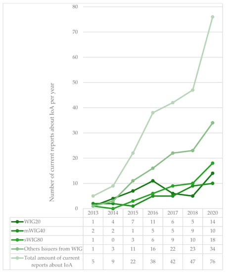 As mentioned earlier, in 2020, 76 current reports indicated the IoA by issuers grouped in the WIG index reached investors. This compares to 163 cases in the entire six-year period of 2013–2018. The annual average was therefore just over 27 current reports. The frequency of asset IoA reporting in 2020 for the entire study population is thus near two times higher than the average value would indicate. The readings relating to the number of current reports on IoA delivered to investors are significantly higher than the average for each subgroup (WIG20, mWIG40, sWIG80, and others). The biggest difference is noticeable in the case of issuers from sWIG80, which in 2020 provided current report on IoA nearly three times more often than in previous years.