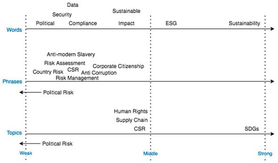 The phrase list had few phrases explicitly linked to sustainability (e.g., as described in the word group sustainable/sustainability/ESG above). In the cases where the phrases and sustainability are linked explicitly, it is often to the weak version of sustainability. For example, companies might tie risk management to ESG but without explaining how that works in practice. The topic model fell in the middle and weak categories, e.g., mentioning human rights but only as a signatory to an anti-slavery statement. The phrases and topics re-embedding support the word list conclusions.
