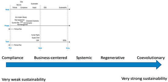 The frequencies and re-embedding process provided several results that support the assumption that the companies in this study treat political risk and sustainability as distinct and convey a business-centered understanding of sustainability, as stipulated by the Landrum and Ohsowski (2018) sustainability spectrum research. A deep dive into the topics indicates this siloing, especially seen when the re-embedding process shows that the political risk topic itself is devoid of links to sustainability. In the case of types of sustainability and the sustainability spectrum, the documents examined here often leave sustainability undefined and vague and/or do not provide specific actions or commitments related to sustainability. This section presents the results in more detail, beginning with exploring the findings for the topics followed by a discussion of sustainability and the sustainability spectrum.
