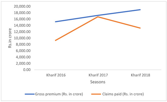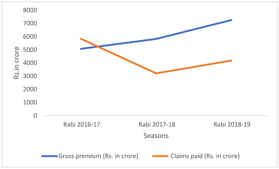 Figure 1 and Figure 2 show the gross premium collection amounts and claims paid under the PMFBY for kharif and rabi seasons from 2016 to 2018. In the kharif and rabi seasons, the gross premium collection amount increased during the time period. In 2016–2017, the total amount of claims paid was lower during the kharif season than the rabi season, but in 2017–2018 more claims were paid during the kharif season compared to the rabi season; thus, the figures below show that the gross premium collection amount was greater than total amount of claims paid under PMFBY during 2016–2017 to 2018–2019.