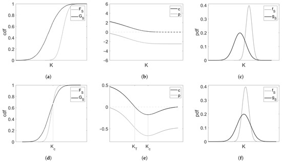 (a) Cumulative distribution functions and of asset S under, respectively, the physical measure and the pricing measure . For all it holds that (b) Functions c and p resulting from the cumulative distribution functions in Figure 1a. (c) Density functions and resulting from the cumulative distribution functions in Figure 1a. (d) Cumulative distribution functions and under the condition that there exists exactly one such that (e) Functions c and p resulting from the cumulative distribution functions in Figure 1d. (f) Density functions and resulting from the cumulative distribution functions in Figure 1d. (a) and ; (b); c and p (c) and ; (d) and ; (e) c and p; (f) and .