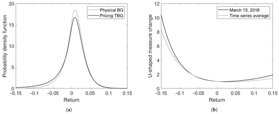 Equations (25) and (30) directly relate the pricing density g to the physical density f. We see that an optimal set of parameters for the pricing density g can be split into a set of parameters characterizing the U-shaped measure change on the one hand, and a set of parameters characterizing the physical density f on the other hand. As first reported by Madan et al. (2020), the calibration procedure thus results in a simultaneous extraction of information on both densities.
