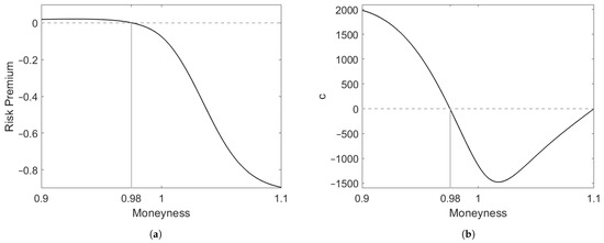 The condition that now easily translates in both and for each value of , using the equality in Equation (15). together with and leads to the conclusion that c can never be zero, meaning that there exists no solution to Equation (7) and no zero-risk premium strike for the call option.