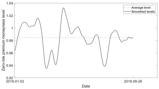 Repeating the work of Section 4.2, we assess on the evolution of the smoothed zero-risk premium strike over time, as displayed in Figure 5. We observe a minimum zero-risk premium moneyness level around 93.4%, an average zero-risk premium moneyness level around 98.5% and a maximum zero-risk premium moneyness level around 103%. The smoother highlights the fluctuations of the zero-risk premium strike around the mean level. These fluctuations are rather small in absolute value, which reveals some general stability over time.