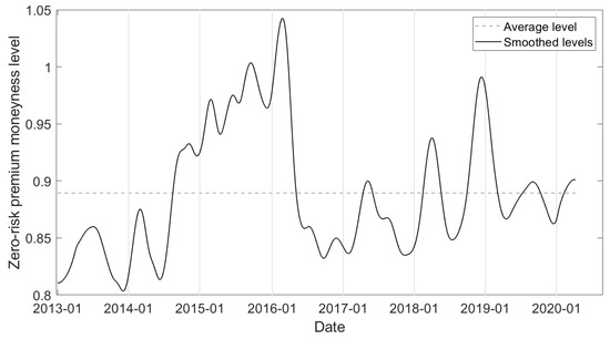 Further, the calibration procedure of Section 3.2 is also executed based on option prices with underlying the DAX index. Performing the same analysis results in the evolution of the zero-risk premium moneyness level of a one-month held-to-maturity European call option on the DAX index, as shown in Figure 6. The moneyness levels are calculated week-to-week, every Friday (see Table 1). The average zero-risk premium level amounts around 88.9%, which is lower than the average level on the S&P500 index. A minimum level around 80% is reached in the period 2013–2014, whereas a maximum level around 104% is reached at the beginning of 2016. As the analysis is performed over a longer time horizon, we clearly see some periods of lower and higher zero-risk premium strikes.