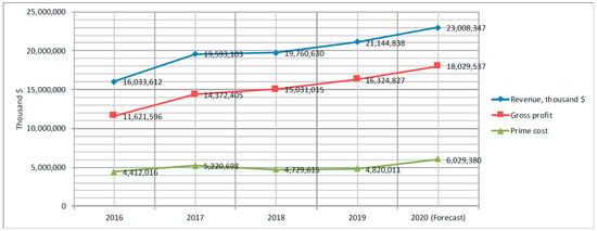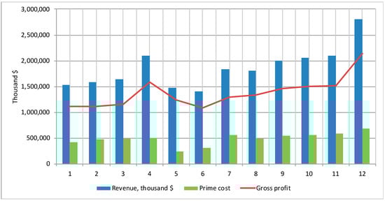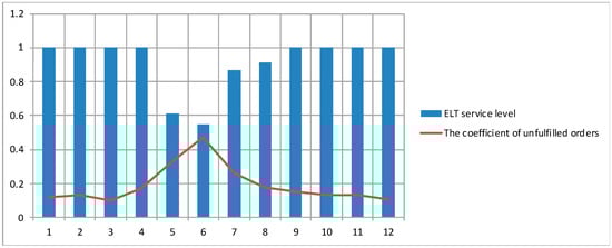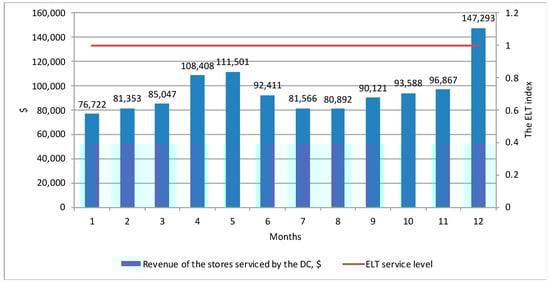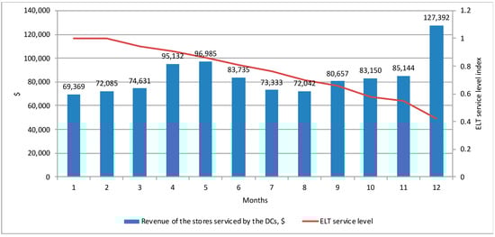 The annual revenue of the serviced stores amounted to USD 1,145,769, i.e., increased by 13% compared to the baseline scenario, and the ELT service level amounted to 100%. The key indicators of supply chain efficiency in the implementation of the second version of the model are presented in Figure 2.