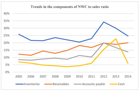 To assess which one of the three components of the NWC contributed most to the decrease in the NWC to sales ratio, Figure 1 reports the behavior of the average inventories, receivables, account payables, and cash deflated by sales through time. There is a slight decrease in the values of inventories, account payables, and cash holdings from 2008 through 2009. This is perhaps due to the uncertainty caused by the financial and liquidity crunch of 2008. The three components of the NWC to sales ratio and the cash holdings remained somewhat stable through time, yet the time period after the year 2011 is marked by a sharp upward movement in all the components of the NWC and cash holdings. This upward trend is more pronounced in 2012, which indicates a shift toward a conservative working capital policy by the management of these firms. However, the year 2014 again witnessed the decline in the components of NWC and cash values, which indicates improvement in the working capital practices.