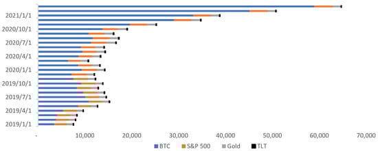 The Market capitalization of Bitcoins, S&P 500, gold, and Treasury Bond.