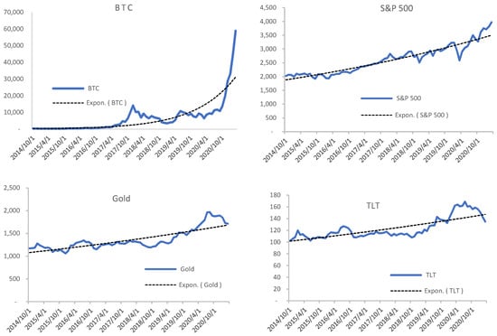 We estimate monthly returns of Bitcoin with that of S&P 500, gold, and TLT ETF (Treasury Bond, Exchange Traded Funds). Statistical tools such as correlation analysis and descriptive analysis are used. We follow the study by () and test the Pearson’s correlation, which evaluates the dependent and independent variable relationship. We did not see any correlation between Bitcoin with other financial assets.