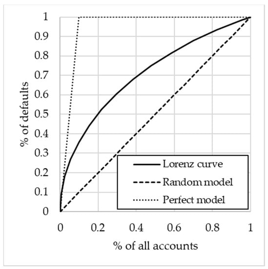 . The Lorenz curve is defined as the graphical plot of the proportion of defaulted accounts against the proportion of all accounts. Mathematicaly the Lorenz curve is defined by