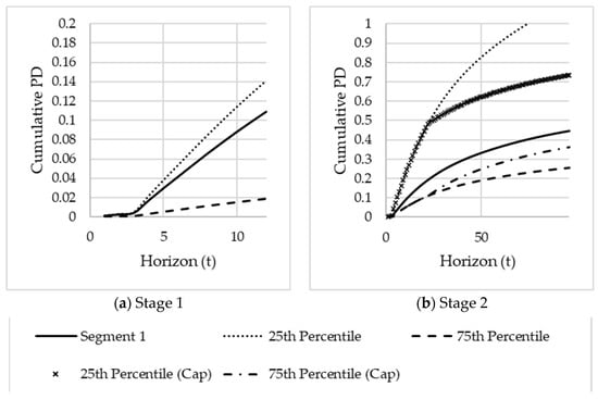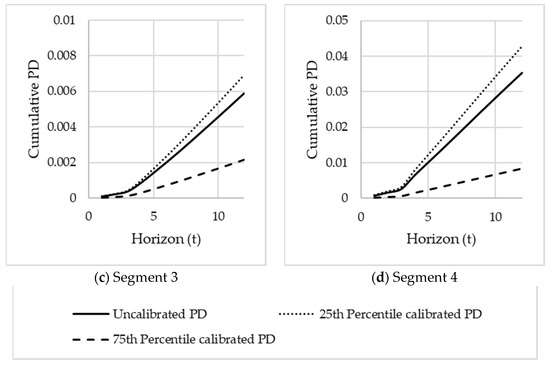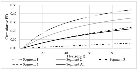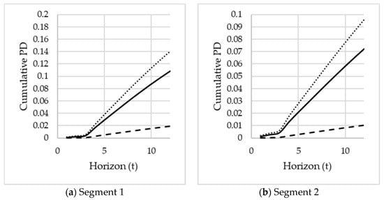 Comparison of the cumulative segmented PDs to cumulative unsegmented PDs over time for different horizons: This test will confirm whether the difference between the segmented PD term structures and the unsegmented one remains consistent over different horizons months. The PDs can be analysed over time by varying the reference month .
