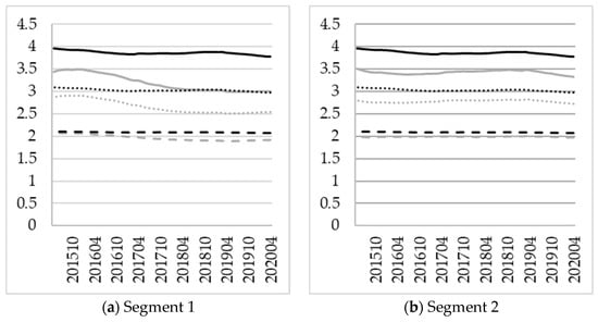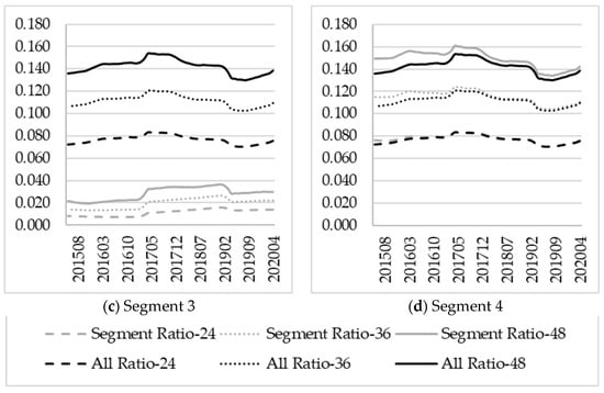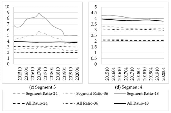 Comparing the ratio of cumulative segmented PDs over different horizons to the 12 month cumulative segmented PD: Define for months. These ratios assess the segmented PD term structure’s steepness. The ratios will also show potential levels of over- or underestimations if only the unsegmented PD term structure is used. The ratios can be analysed over time by varying the reference month .