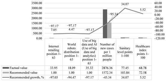 According to Table 3, the number of cases per 1 million people (n2) reduces is the position in the ranking (approach to the top of the ranking, i.e., increase of the level) of world robots distribution (d2, correlation: 20.07%) and the use of big data and AI (d3, correlation: 14.43%) decreases.