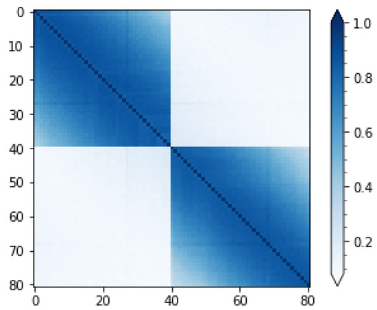 We estimate the kernel matrix using the circuit from the previous section with two different techniques. Using (10) and (14), we classically compute for each pair by matrix multiplication. Here, classically computing the kernel is possible due to the simple structure and low dimension of the unitary operator (14). This procedure is hereafter referred to as a state vector simulation. Figure 1 displays the estimated kernel matrix. This matrix has an interesting structure: it is block-diagonal. This is due to the fact that the second quadrant of the matrix correspond to the inner products of the female population groups. These share the common characteristic ’female’, and each row is similar to its neighbours due to the encoding: similar ages are also similar in the quantum feature space. Analogously, the fourth quadrant of the matrix contains the male population groups. The first and third quadrants contain the inner products between male and female population groups and so are dissimilar in the quantum feature space.