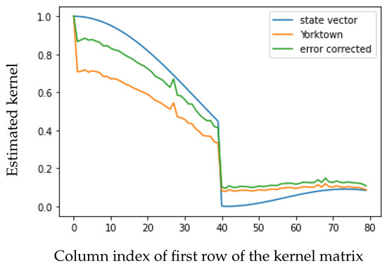 Figure 3 displays the first row of the kernel matrix, estimated from state vector simulation and from the Yorktown quantum computer, as well as the corresponding error-mitigated kernel. The error mitigation procedure vastly improves the kernel estimate for the first half of the columns and only slightly worsens it for the second half of the columns. The estimation error, measured as the distance from the state vector simulation kernel in the Frobenius norm, is reduced from 15.18 to 8.07, indicating that the approach is functioning as intended.