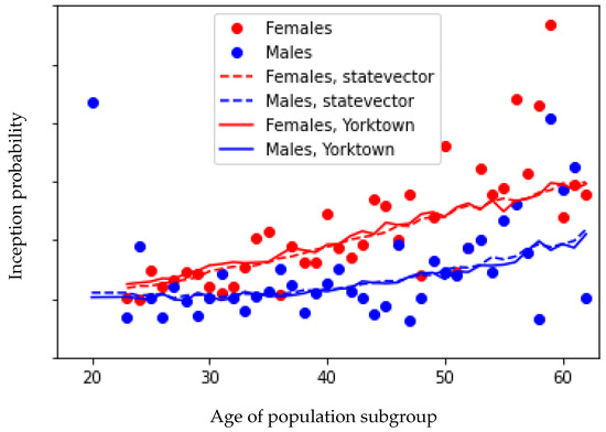 We note, especially, that the estimated inception rates from the Yorktown quantum kernel are comparable to the ones obtained from the state vector simulation, even though the estimated quantum kernels were themselves quite different. We believe that this is due to the fact that the characteristics of the kernel, namely the block-diagonal structure and the increasing dissimilarity with increasing age difference, were preserved, even though the actual kernel estimates differed significantly from each other. This fact proposes some degree of robustness to the model: even though the quantum kernel is estimated with significant error, the resulting disability inception estimates are only marginally impacted.